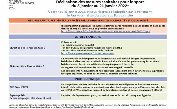 Concernant la reprise du football: la déclinaison des mesures sanitaires dans le sport vient d'être actualisée pour les 3 prochaines semaines (du 3 au 24 janvier 2022).
