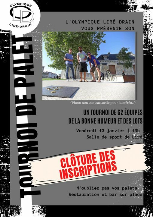 Pour les 62 équipes inscrites, rendez-vous le vendredi 13 janvier à la salle de sport de Liré, à partir de 19h00 pour le pointage et le règlement (pour les équipes n'ayant pas déjà réglé).